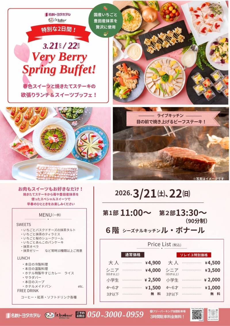 名鉄トヨタホテル「ル・ボナール」にて、2日限りの特別ブッフェを開催します。 今回の目玉は、目の前で焼き上げるビーフステーキと、地元・豊田産抹茶&国産いちごをふんだんに使ったスイーツの共演です!